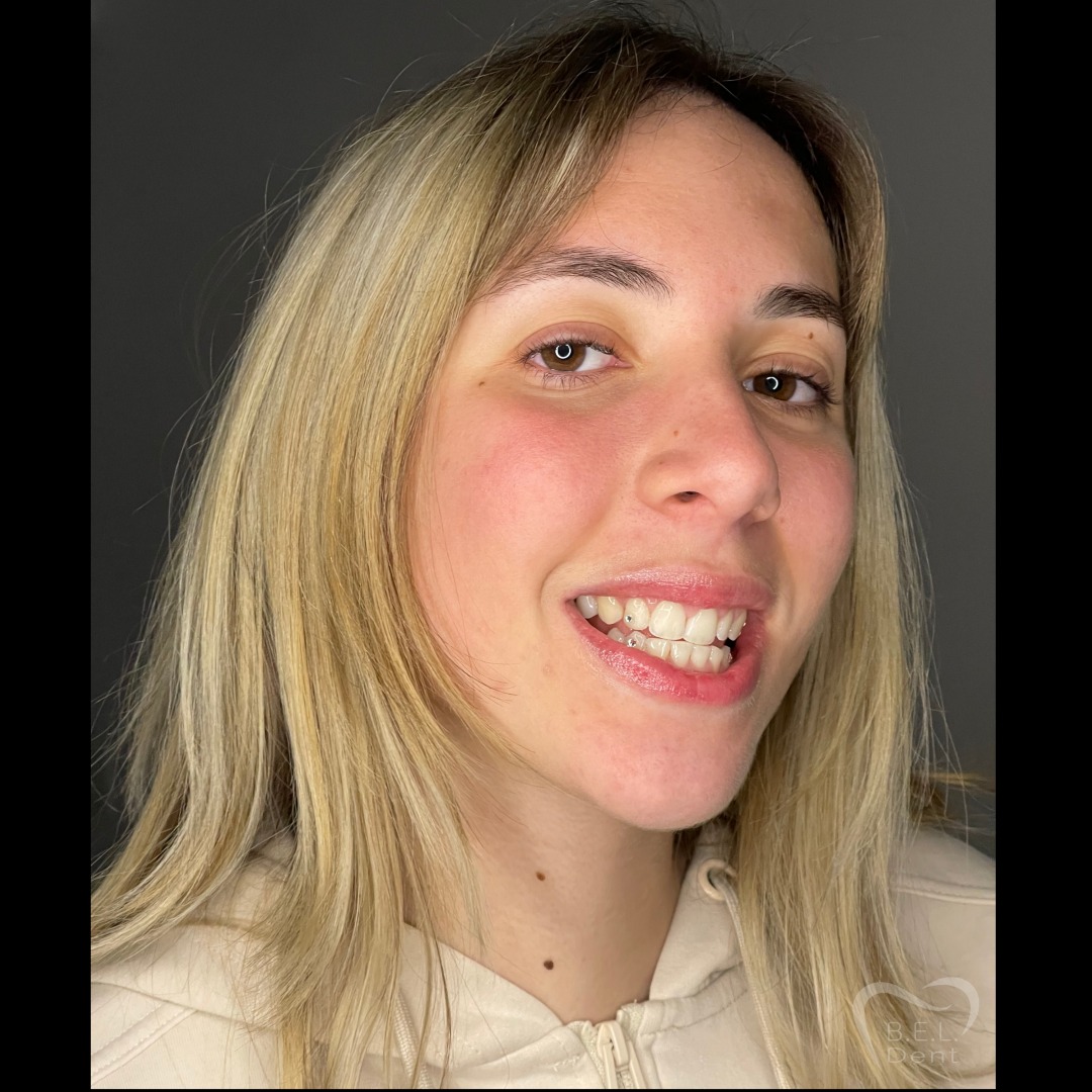 La paziente ha scelto di impreziosire il proprio sorriso con gemme dentali scintillanti, aggiungendo un dettaglio elegante e moderno. Un tocco estetico discreto che rende il sorriso unico e luminoso.