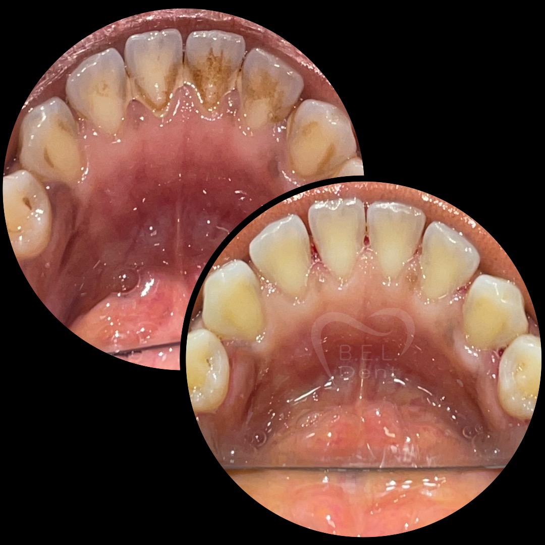 Il paziente ha effettuato una seduta di detartrasi dei denti frontali inferiori, rimuovendo tartaro e placca batterica accumulata. Dopo il trattamento, i denti risultano visibilmente più puliti, più sani e con un aspetto più estetico